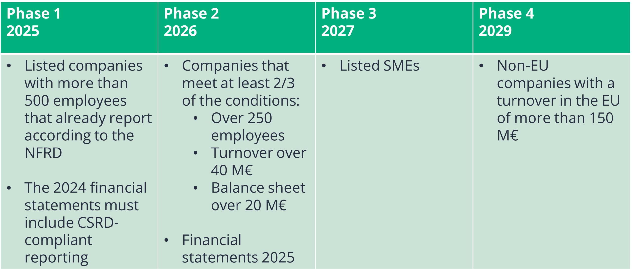 CSRD reporting will apply to different companies at different phases (see figure below). The main point to remember is, that the reporting relates to the financial statements for the year ended. The first phase will come into force in 2025, meaning companies will report data for 2024 (note, this is already next year!). So, if a company belongs to the first phase, it should know already next January what data it needs to collect and start preparing for reporting.